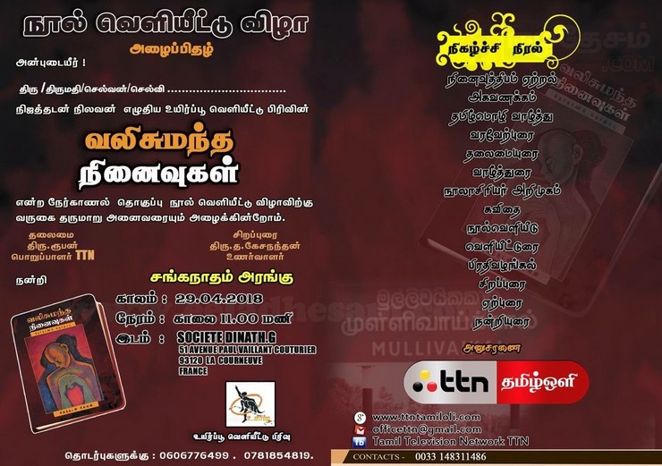தமிழினப்படுகொலை வரலாறு திட்டமிட்டு மறக்கடிக்கப்பட்டு வரும் இன்றைய சூழலில் வலி சுமந்தவர்களின் நினைவுகளை அடைகாத்து உலகத்தார் மனச்சாட்சியின் முன் ஆவணத்தொகுப்பாக கொண்டுவந்திருக்கும் ‘வலிசுமந்த நினைவுகள்’ நேர்காணல் தொகுப்பு நூல் வெளியீட்டு விழா நிகழ்வு வவn-தமிழ்ஒளி அனுசரணையுடன் பிரான்ஸ் SOCIETE DINATH.G, 51 AVENUE PAUL VAILLANT COUTURIER, 93120 LA COURNEUVE என்னும் இடத்தில் உள்ள சங்கநாதம் அரங்கில் வரும் ஞாயிறு அன்று காலை 11.00 மணிக்கு நடைபெற உள்ளது.
