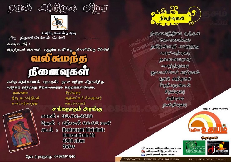 இதனைத் தொடர்ந்து நூல் அறிமுக விழா நிகழ்வு எதிர்வரும் திங்கள் அன்று (30.04.2018) சுவிட்சர்லாந்தில் நடைபெற உள்ளது. சுவிட்சர்லாந்து Restaurant Kleinholz, Hausmatrain 48, 4600 olten எனுமிடத்தில் உள்ள சங்கநாதம் அரங்கில் நடைபெற உள்ளமை குறிப்பிடத்தக்கது.