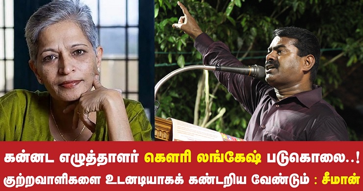 எல்லாராலும் அறியப்பட்ட அறிவும், ஆற்றலும் நிரம்பிய ஒரு எழுத்தாளரின் உயிருக்குக்கூட இந்நாட்டில் பாதுகாப்பு இல்லை என்பது மோடி தலைமையிலான பாஜக அரசின் இந்துத்துவ உள்நோக்கப்பணிகளை அம்பலப்படுத்தியிருக்கிறது. இப்படுகொலை குறித்து மத்திய அரசு, சி.பி.ஐ. விசாரணைக்கு உத்தரவிடுவதோடு உண்மைக்குற்றவாளிகளை உடனடியாகக் கண்டறிந்து சட்டத்தின் முன்னால் நிறுத்த வேண்டுமென நாம் தமிழர் கட்சி வலியுறுத்துகிறது. ஏற்கனவே, படுகொலை செய்யப்பட்ட புகழ்பெற்ற எழுத்தாளர் கல்புர்கி படுகொலை குறித்தக் குற்றவாளிகள் இன்னும் கைதுசெய்யப்படாத நிலையில் எழுத்தாளர் கௌரி அவர்களின் படுகொலையும் நடந்திருப்பது நமக்குப் பல்வேறு சந்தேகங்களை எழுப்புகிறது. எனவே, மத்திய, மாநில அரசுகள் உரிய நடவடிக்கை எடுத்து கன்னட எழுத்தாளர் கௌரி லங்கேஷ் அவர்களின் கொலையில் தொடர்புடைய அனைவரையும் விரைவாக கைதுசெய்ய வேண்டும் என கேட்டுக்கொள்கிறேன்.