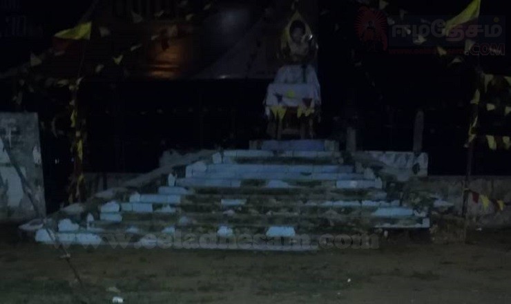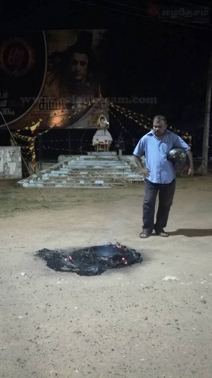 இந்நிலையில், இன்று இரவு அந்த இடத்திற்குச் சென்ற சில இனந்தெரியாத, அரச ஆதரவுபெற்ற கைக்கூலிகள் ரயர் ஒன்றை நினைவுத் தூபிக்கு முன்பாகப் போட்டு எரித்துவிட்டு தப்பிச் சென்றனர்.