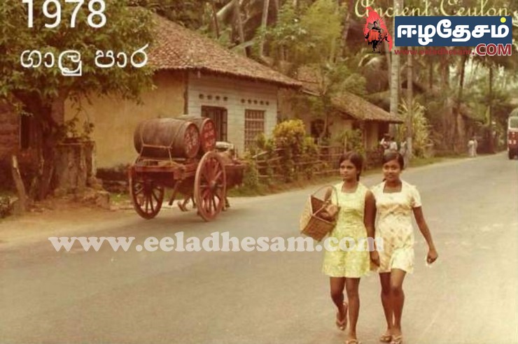 ஸ்ரீலங்காவின் தென்பகுதியில் ஒரு வீதியோரமாக நடந்து செல்லும் இரண்டு இளம் பெண்கள். வீதியின் மறுபக்கம் எண்ணெய் வண்டில் செல்கின்றது. அன்றைய காலத்தில் வண்டில்களில் ஒவ்வொரு ஊர்களுக்கும் சென்று மண்ணெண்ணெய் விற்கப்பட்டுள்ளது. இன்றைய எண்ணெய்த் தாங்கிகளைப்போல அன்று இந்த வண்டில்கள் பயன்பட்டுள்ளன.